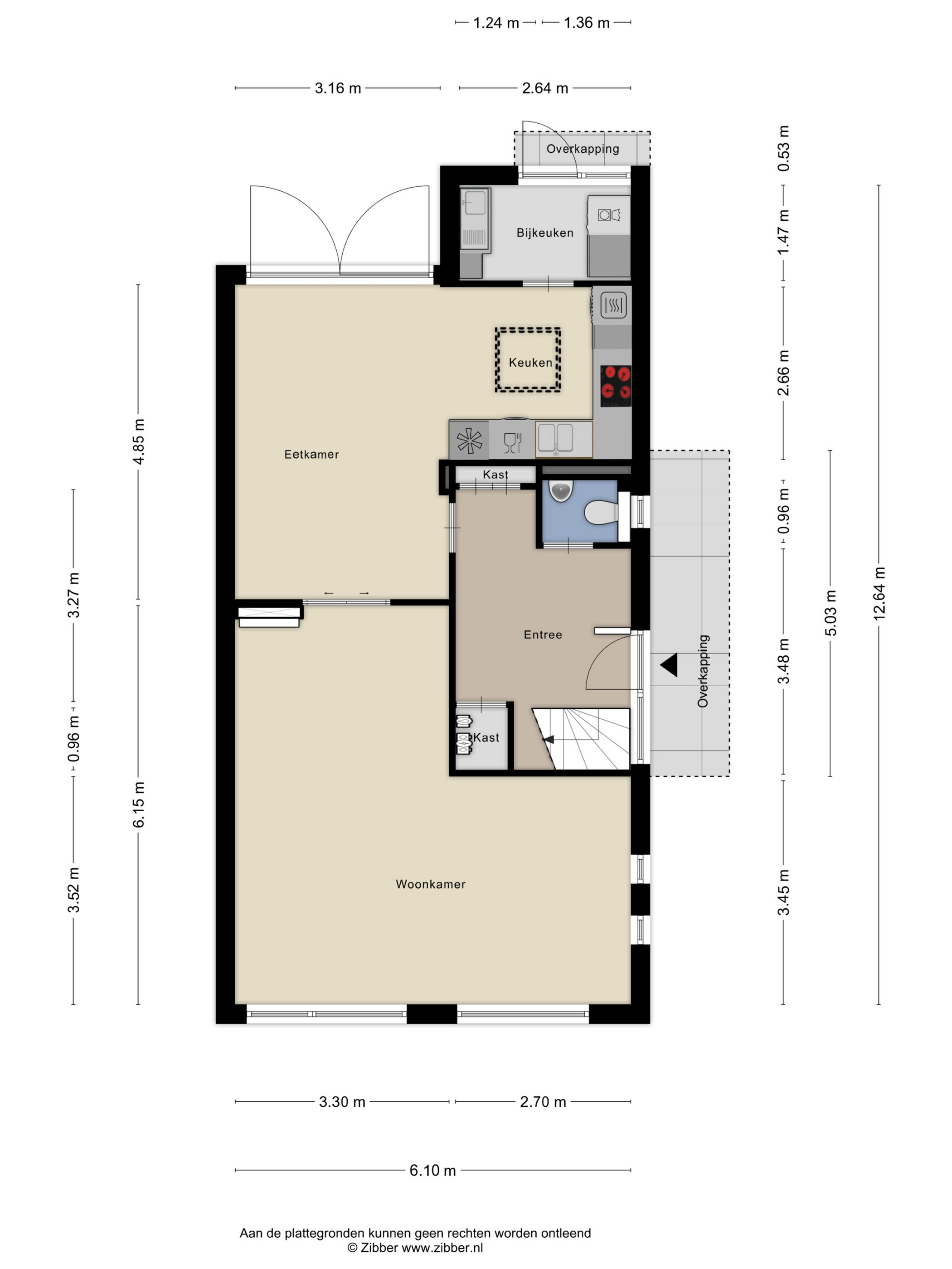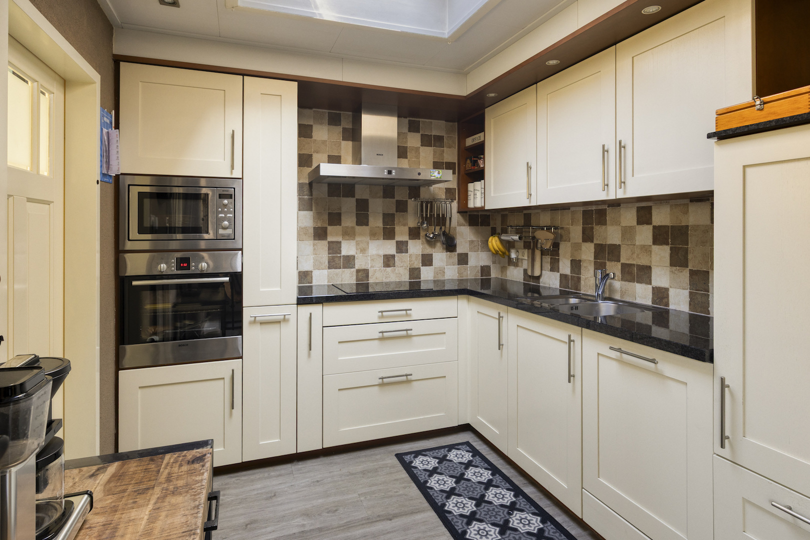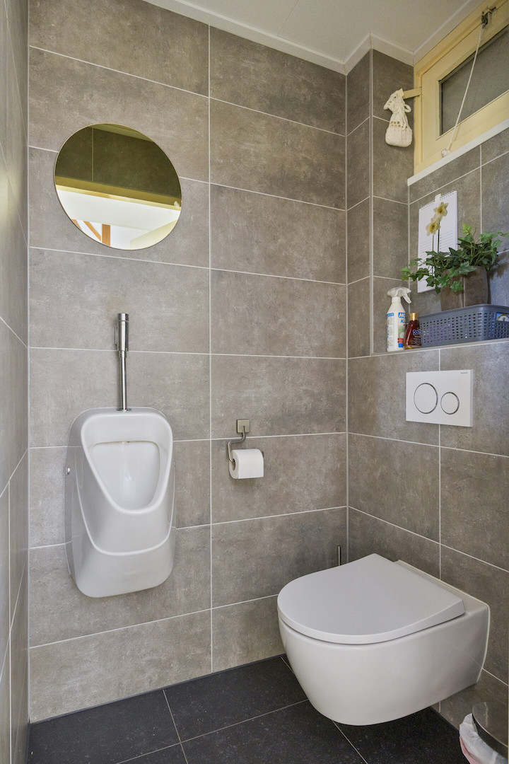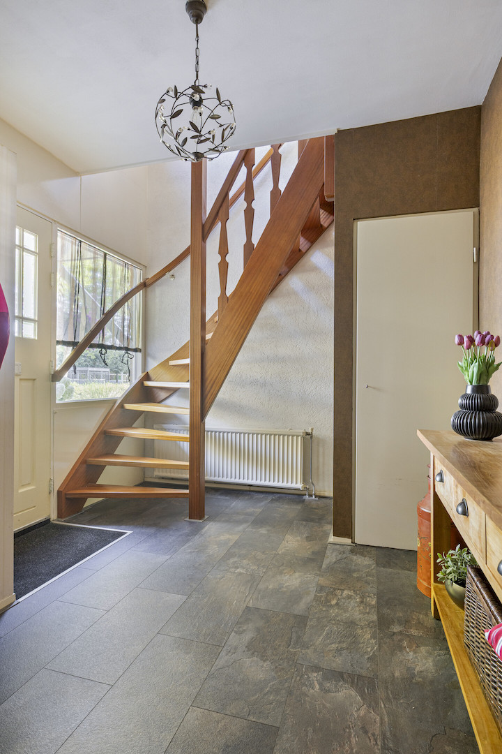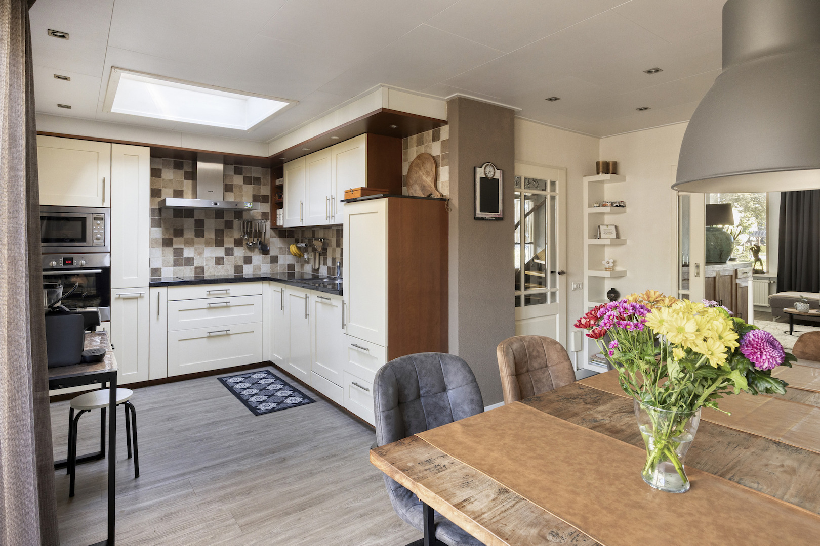 Ruime hal met meterkast en trapopgang. Toiletruimte. Riante woonkeuken met terrasdeuren en hoekaanrecht (inbouwapparatuur; vaatwasser, inductiekookplaat, oven, magenetron, koelkast, afzuiger in schouw). Bijkeuken/achterentree met wasmachine-aansluiting.