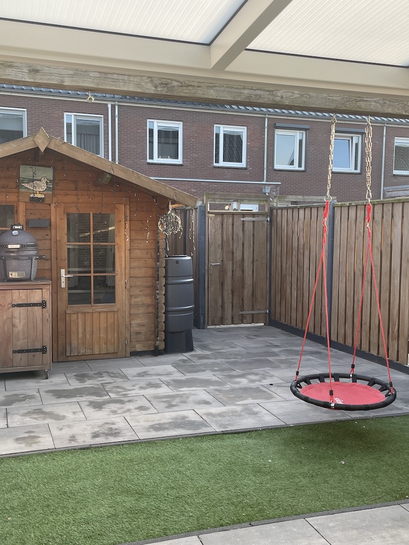 Ruime, betegelde achterstraat, bereikbaar via een steeg. Aluminium overkapping met verlichting tegen de achtergevel (± 4,85 x 3,00 m). Houten fietsenberging (± 2,75 x 2,35 m)