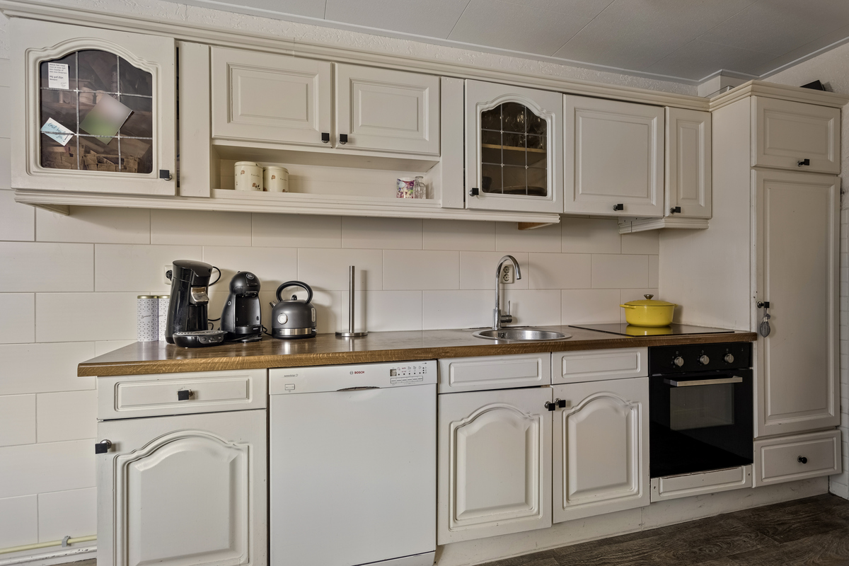 Via de entree kom je in de hal met meterkast, toiletruimte en trapopgang. De praktische kelder biedt extra opbergruimte. De keuken is uitgebouwd en voorzien van een rechte opstelling met inductiekookplaat, oven, vaatwasser en afzuigkap. De doorzonwoonkamer, met schouw en palletkachel, biedt veel lichtinval en comfort. In de aanbouw is er een bijkeuken met achterentree en wasmachineaansluiting, een berging aan de bijkeuken, evenals een afzonderlijke fietsenberging te bereiken vanaf de achterstraat.